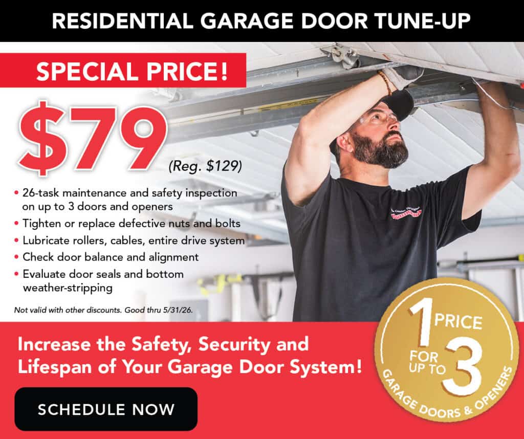 $79 Residential Garage Door Tune-Up. 1 price for up to 3 residential garage doors and openers. MAY ONLY!! *Not valid with other discounts.